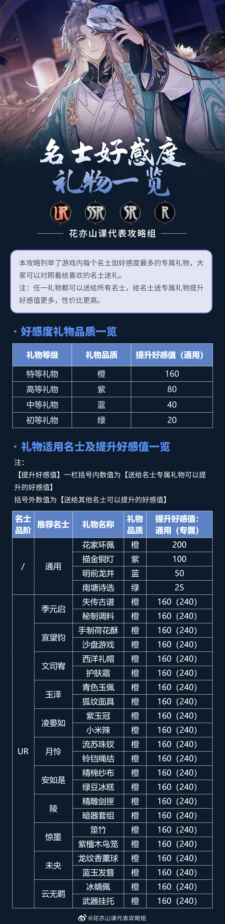 1.图中就是全部礼物代表的好干堵数值,要注意的是有些礼物送给特定的名士会有额外的好感度,这样是最合适的礼物赠送选,送名士尽量选择专属礼物