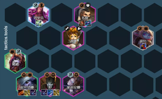 8人口最后补充一个风女即可,如果猫咪来得早也可以直接下掉宝石(宝石的名流格子不是在最后一排的角落)。阵容全体2星以后,可以直接拉9人口补充猫咪或者塔姆,塔姆是用来去吃薇古丝的,跟灵风一个道理。猫咪能够补充布隆的坦度。