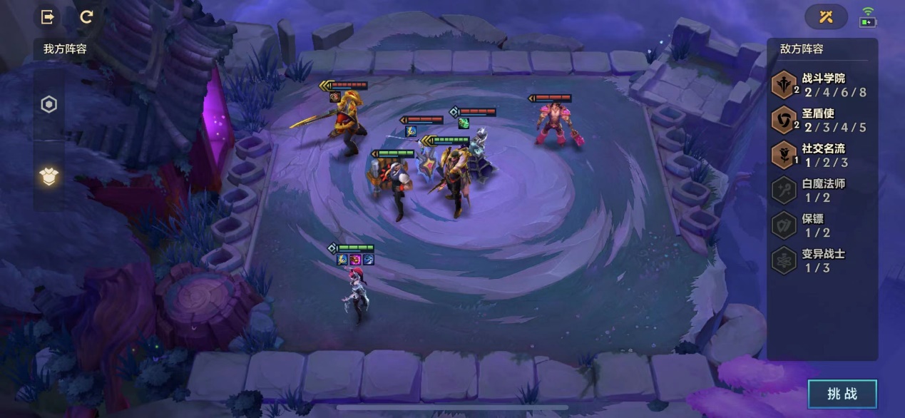 是由携带“荆棘之甲”的『3星盖伦』、携带“大天使之杖”的『1星蕾欧娜』、携带“朔极之矛”的『2星卡萨丁』和『1星塔里克』组成的2战斗学院2圣盾使1社交名流作为我们的对手。