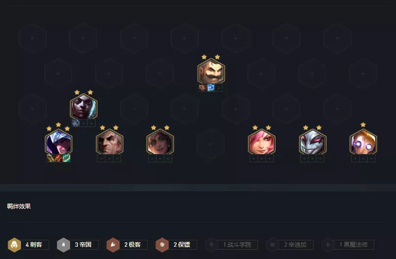看自身装备情况,如装备上不契合,没有宝剑、拳套、反曲中两种,就不建议这套阵容,开局没有无尽,可看情况卖血3回合拿取无尽或火炮的配件。2-5之后看自身棋子质量,能锁血升级5人口争取转连胜。阵容方面直接选择保镖刺体系就可。刺客这版本前中期强度非常高。