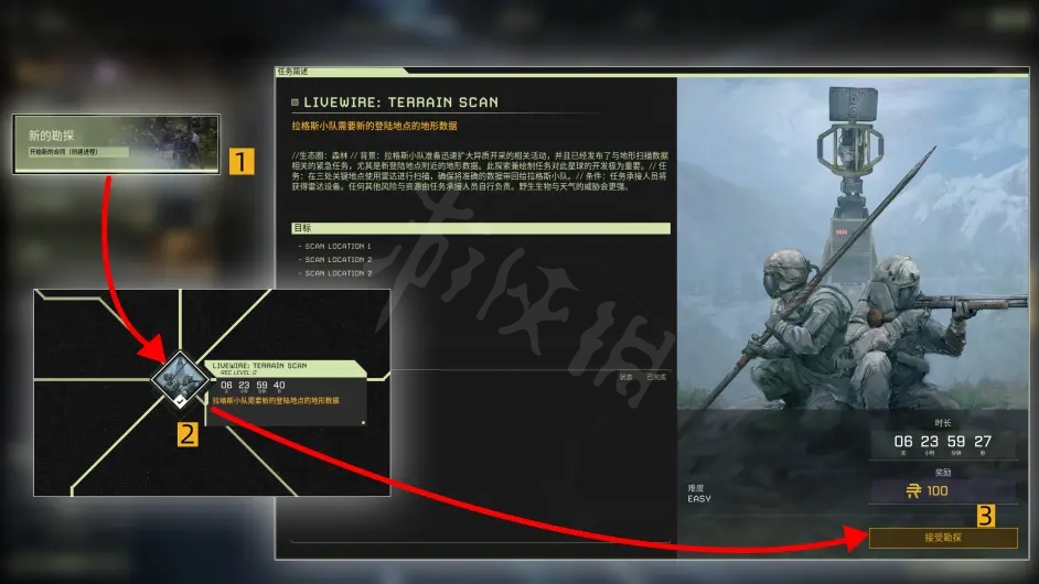 1.2 点击“新的勘探”,开始新的合同,注意:要选择一个有任务目标的合同,而且这次任务需要失败,此为关键性前置条件。