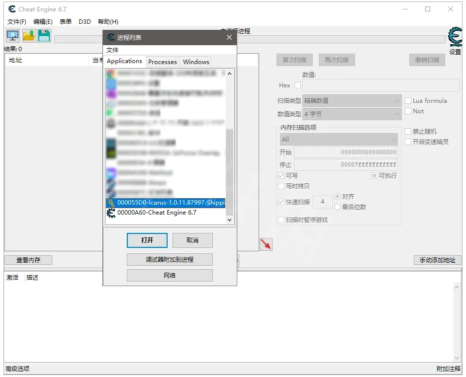 1.7.1 打开Cheat Engine,打开翼星求生的进程,并搜索当前经验值:124。