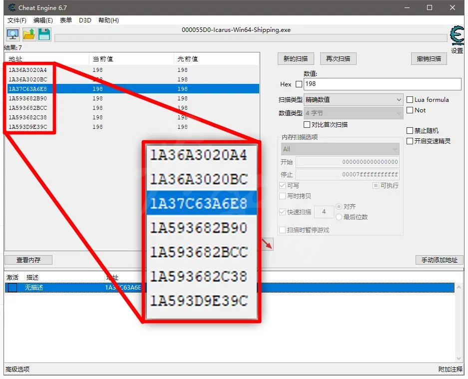A.双击每一个地址,将其添加到下方的候选窗口中,并点击每一个值,都进行修改。这种一网打尽满河鱼的方法我并不推荐,因为这样在无意间又增加了我们的“苦力时间”。