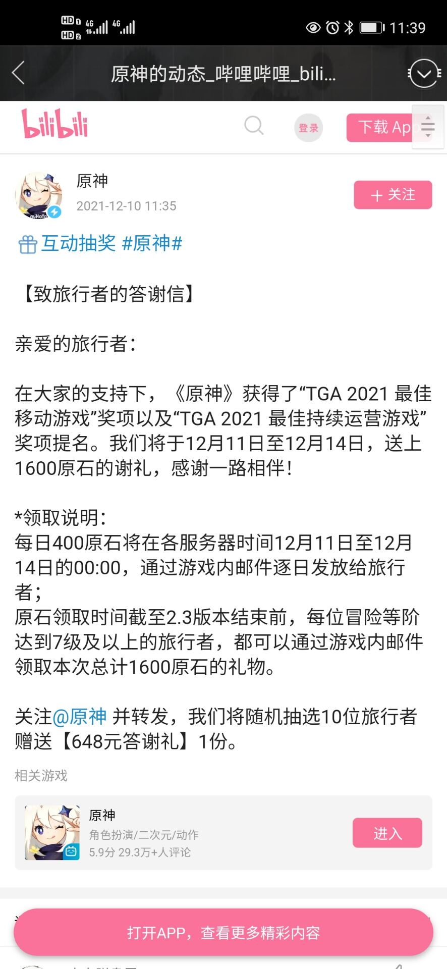 《原神》 获得了"TGA2021最佳移动游戏” 奖项以及"TGA2021最佳持续运营游戏”奖项提名。我们将于12月11日至12月14日,送上1600原石的谢礼,感谢一路相伴! *领取说明: .每日400原石将在各服务器时间12月11日至12月14日的00:00,通过游戏内邮件逐日发放给旅行者;原石领取时间截至2.3版本结束前,每位冒险等阶达到7级及以上的旅行者,都可以通过游戏内邮件领取本次总计1600原石的礼物。
