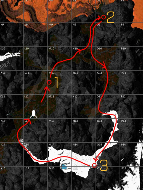 要走很长很长的路才能找到样本3,首先在O-12的左上角位置设置导航点然后穿过这里的山口,准备进入北极,O-11以北的区域出现的掠食者比较少,但是也要小心可能会刷出来的熊。在森林的北极的过渡区域建造庇护所,放一个床,设置重生点,然后身上带10块熟肉。如果身上还没有护甲,那就在烹饪食物期间顺便做一套。