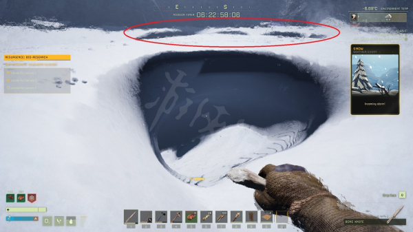 在N-14东南角的一个雪坑中能够找到生物样本,但这里坑坑洼洼的,走的时候要小心。