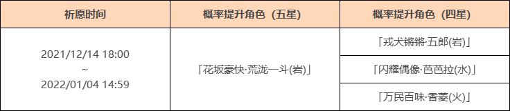 活动期间,限定五星角色「花坂豪快·荒泷一斗(岩)」的祈愿获取概率将大幅提升!