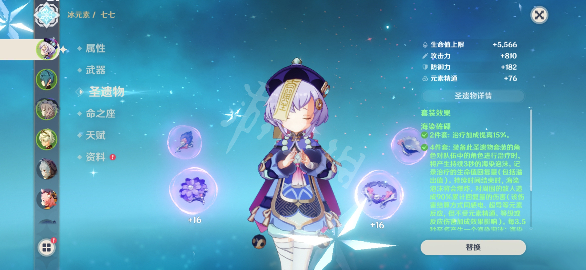 刷海染套让七七瞬间转主c,圣遗物主磁条全堆攻击值就行了。被动的泡泡伤害取决于她的治疗量,治疗量又取决于她的攻击值。武器也带有充能效率的,或者加攻击的。