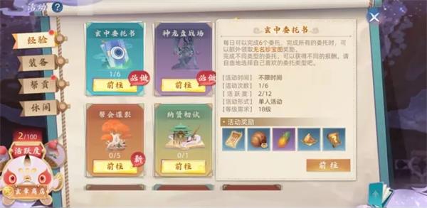 完成玄中委托任务不仅能获得各种道具奖励,还会获得大量经验!玄中委托的任务虽然简单又能获得大量经验,但也不要贪多。玩家每天最多能完成6次委托任务,当天完成全部委托任务还能获得额外奖励——无名藏宝图。这可是游戏中的好东西,有可能挖到各种稀有道具。