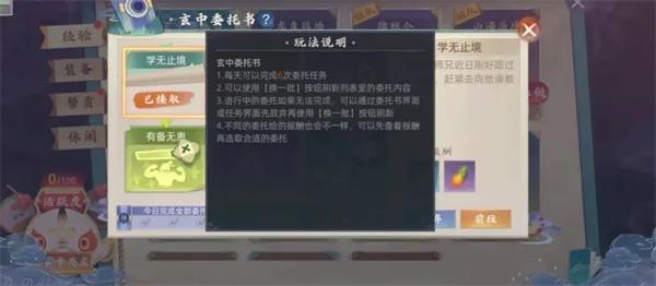 不同类型的委托任务,也给了大家不同的选择。喜欢pk战斗的大佬玩家,可以看看学无止境和失控元兽任务,直接武力解决获得奖励;而有着收集控的玩家,则可以接取有备无患任务,上交平时收集到的各种游戏物品,顺便还能清空背包呀!热衷于各种玄中八卦的玩家,蓝色的委托任务绝对是你的不二选择。听听玄中大陆中的各种八卦就能完成任务,这样的好事哪里有呢!不管怎样,相信大家在玄中委托界面中都能接取到适合自己的任务哦!