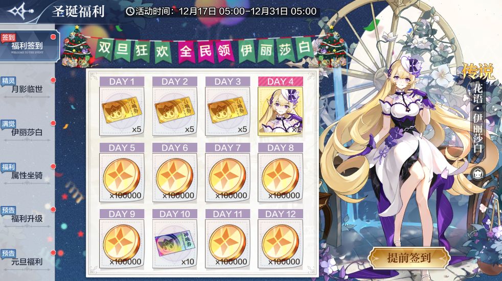 活动内容:双旦狂欢,全民签到即可领取伊丽莎白、大量金币、召唤券、神唤券。
