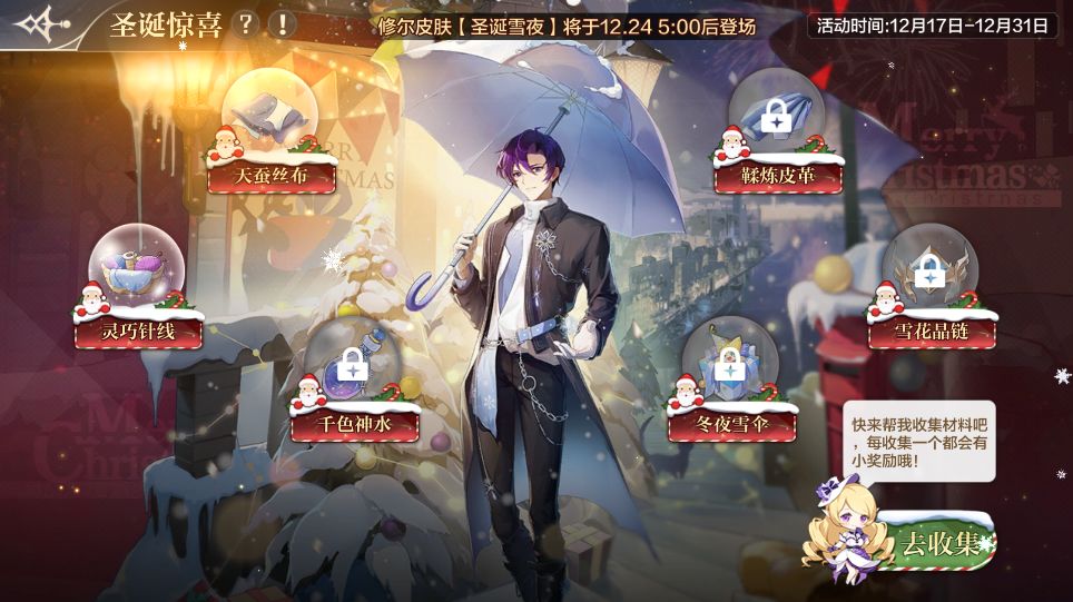 活动内容:圣诞将近,伊丽莎白正在筹备着为修尔制造一个圣诞惊喜,她需要在精灵大陆的各个地方,寻找珍稀的材料,来为修尔制作一套圣诞新衣,你愿意来帮助她吗?收集材料达到指定进度,还可以领取进度奖励哦!