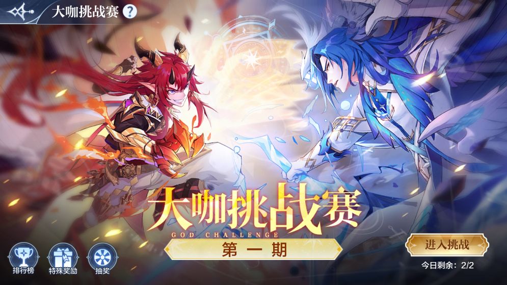 活动内容:大咖挑战赛一周开放一期,每周重置进度、排行榜数据、特殊奖励。大咖挑战赛中敌阵的玩家数据来源于每个区服竞技场排行前5的玩家,每个敌阵玩家每轮会随机8名作为大咖。战胜大咖们,获得属于你的奖励吧!