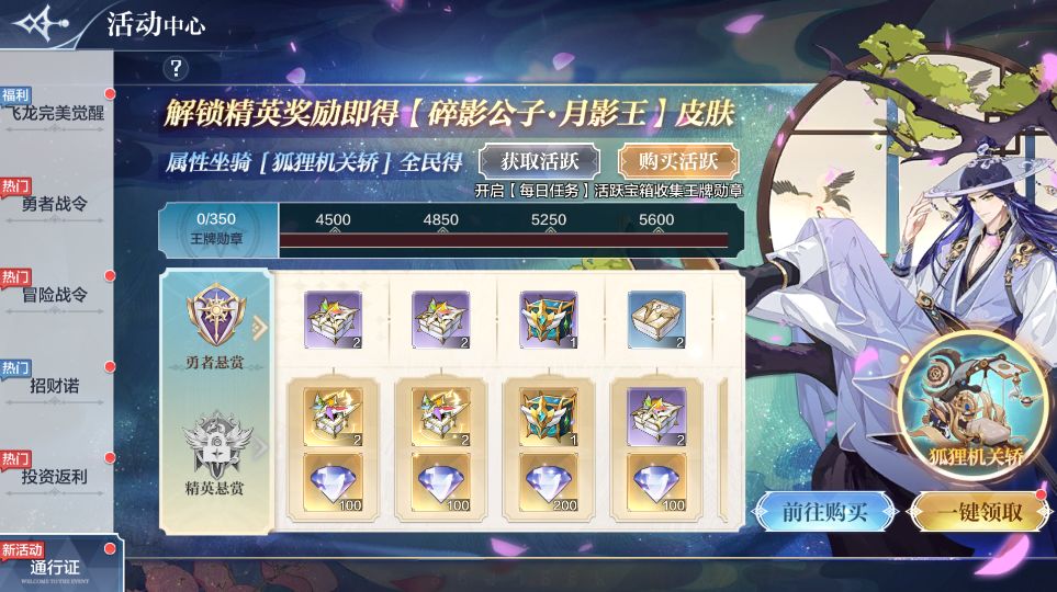 活动内容:通行证全新赛季开放,完成任务达到累计王牌勋章数,即可领取全新坐骑【狐狸机关轿】*1(带属性坐骑)!解锁精英奖励还可以立即获得月影王全新皮肤【碎影公子·月影王】!
