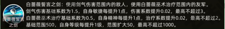 特色技能是白蔷薇誓言之剑,能够对敌人造成伤害同时治疗友军。