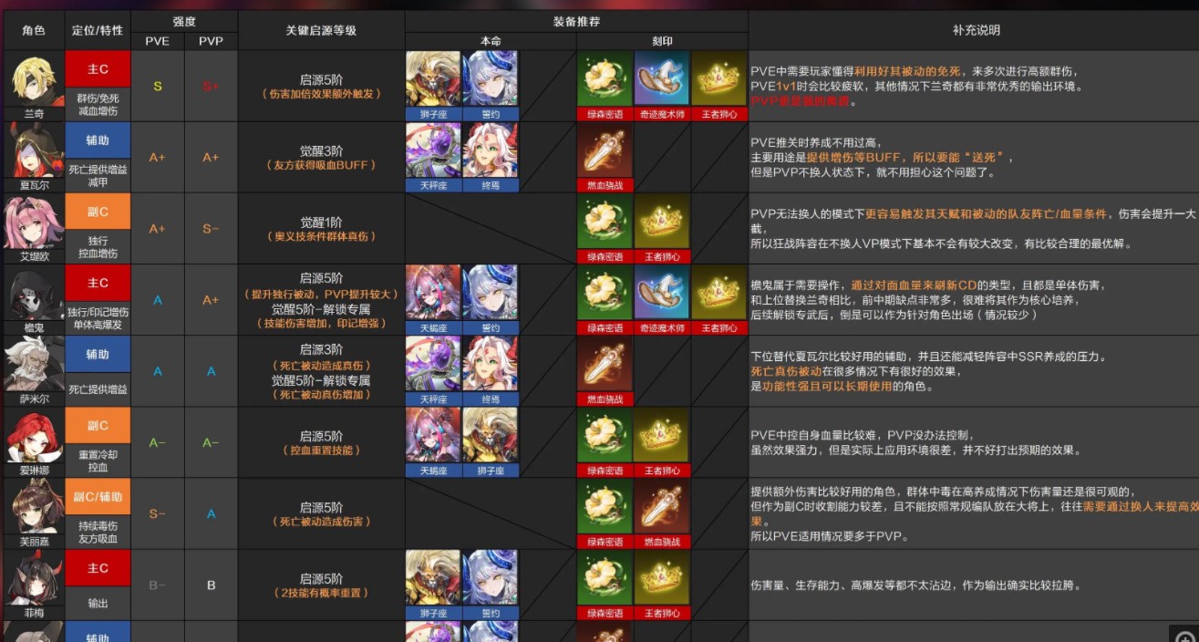 1.挑选角色培养的话可以根据图表中的评分来选择,并且这里有一些对应角色的简单培养建议,让玩家们能够更加了解这些角色,也能够选择出最适合自己队伍的角色