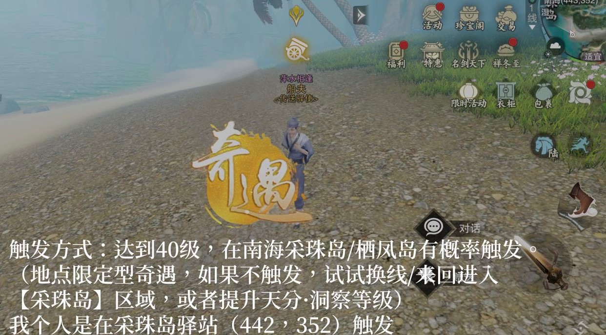 3.触发方式:达到40级,在南海采珠岛或栖凤岛有概率触发。(地点限定型奇遇,如果不触发,试试换线/来回进入【采珠岛】区域,或者提升天分·洞察等级)