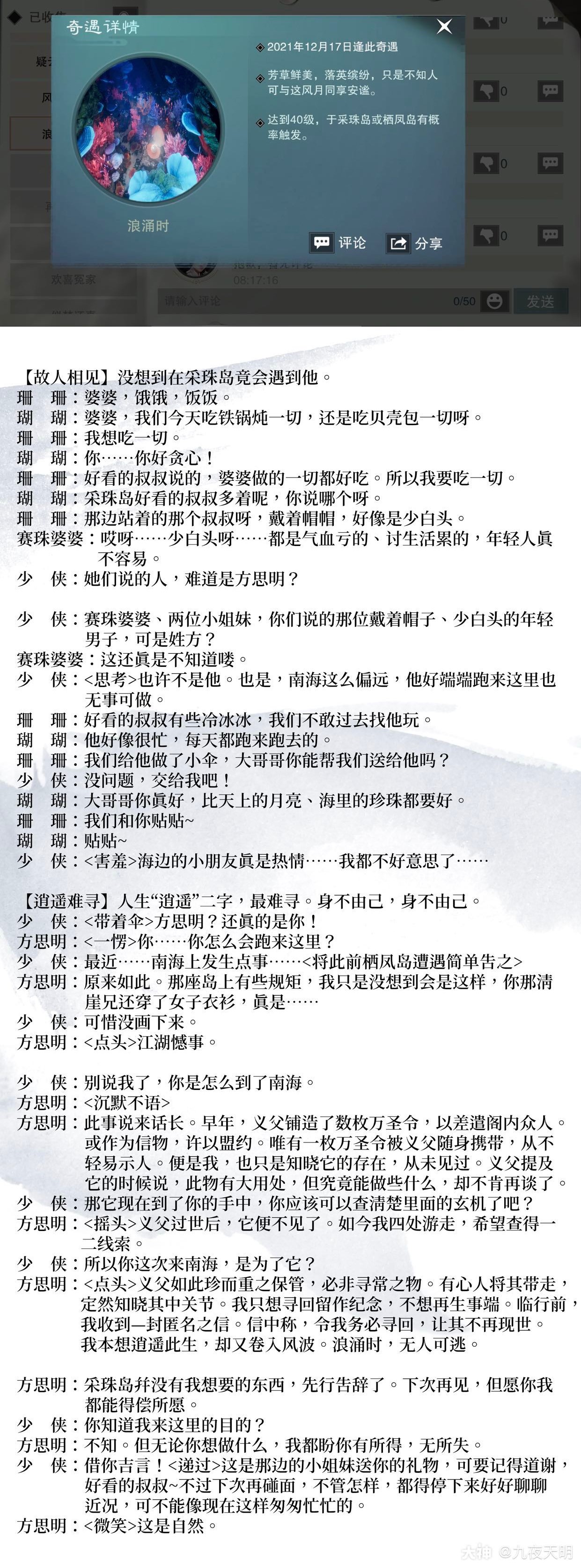 4.感觉是未来主线的预告,应该比较好触发,来回进出采珠岛和栖凤岛还是触发不了的话,可以试试去剧情NPC附近(645,358)晃悠。