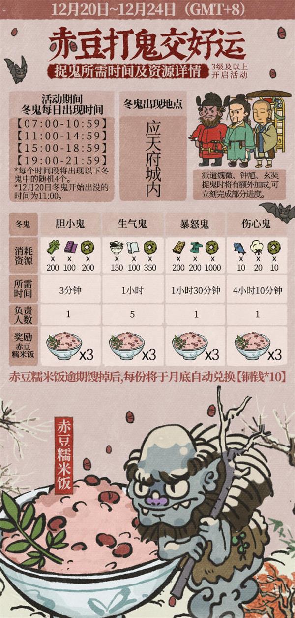 周一至周五每天4个时间段(除去今天只有3个)各刷新4个小鬼,【驱赶1个小鬼获得3个赤豆糯米饭】,所以驱赶【17个小鬼】即可高枕无忧。