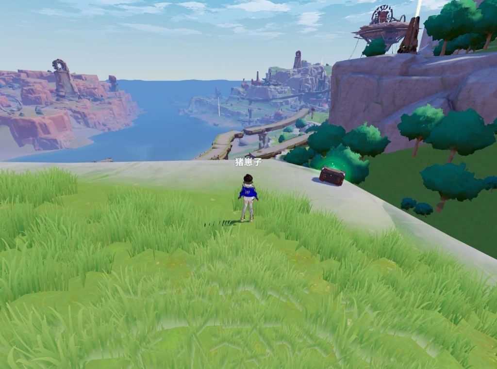3、下到下面一层平坦草地,往断桥的方向走就可以看到。