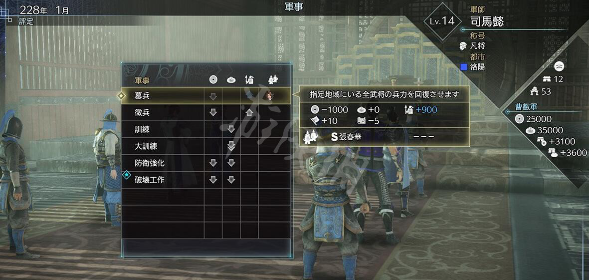 合作完成内政指令获得更佳的效果:在内政中,其他我方武将也会各自进行指令,而当与其他武将进行同一项指令时,将发动合作。