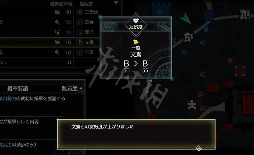 在本作中,将有显示玩家与各武将的信赖关系的友好度,当友好度提高后,将获得武将协助强化势力等各式各样的帮助。