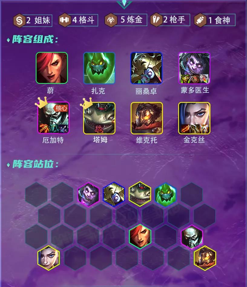 5阶段后:阵容最晚5-1升级8人口,大搜卡,找齐5炼金4斗+双枪。金克丝没2星前可用2星普朗克,强度比金克丝略高。在塔姆来之后看自身装备情况选择喂养法强或者血量。塔姆是阵容关键输出点,特别是能直接吞掉敌方关键坦,让厄加特输出直打后排。如果有炼金转职可下辛吉德或维克托上悠米,如果没有在阵容大部分棋子2星稳血后(特别是蒙多与厄加特必须二星)就可攒钱升级9人口添加悠米,搜金克丝与塔姆2星。
