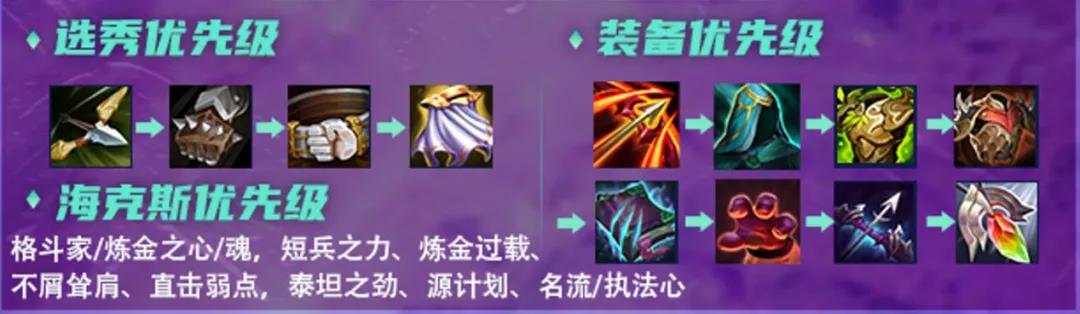 这套阵容不算吃海克斯强化,但如果有格斗家/炼金之心/魂,短兵之力(厄加特需要第二排站位)、炼金过载最优,其他可考虑不屑耸肩、直击弱点,泰坦之劲、源计划、名流/执法心等。