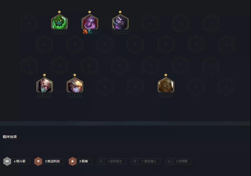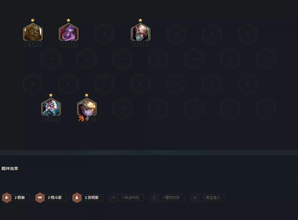 3阶段:3-2左右升级6人口,如果阵容强度较低就小搜卡,如果阵容质量够就攒钱准备升级7人口。如果白嫖蒙多或扎克就开4斗士+2极客/枪/狙神,如果没有就添加强势棋子如塔里克。这阶段主要就是稳血,开始准备向炼金斗枪转型。
