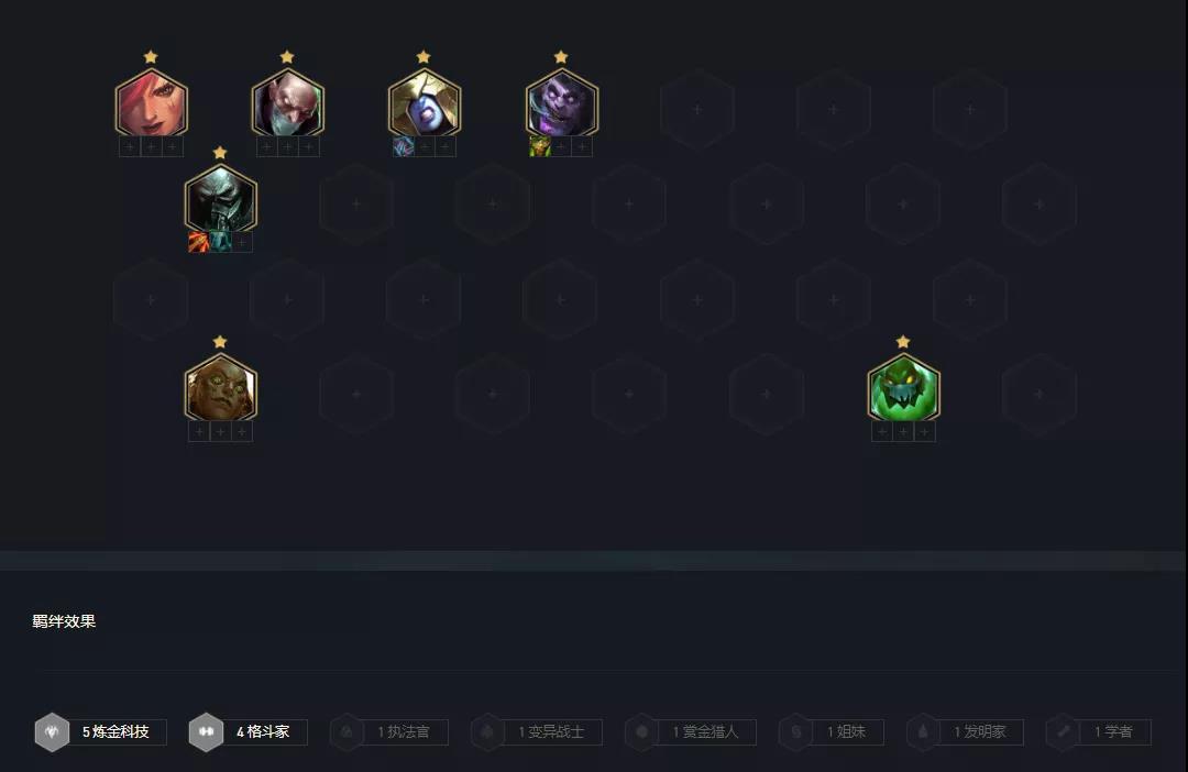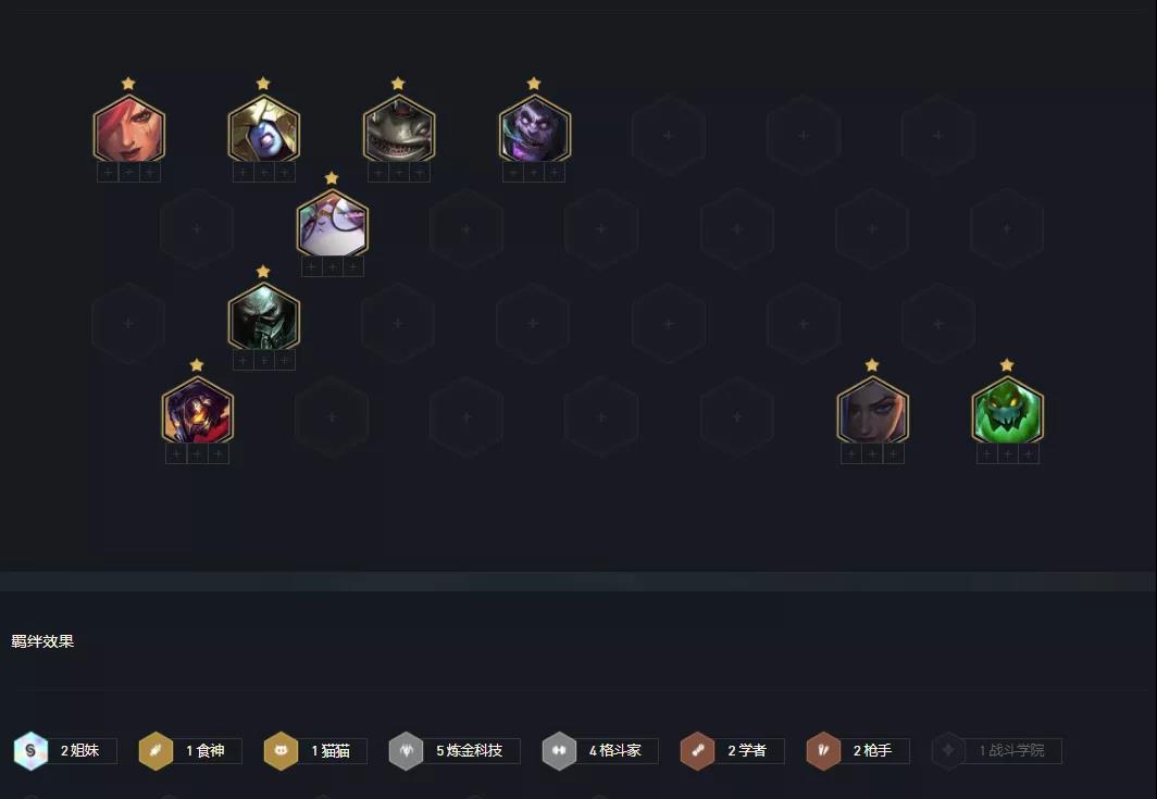 阵容羁绊:2姐妹 4格斗 5炼金 2枪手 1食神