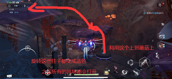 3、之后利用右边的风场飞到蘑菇上,一直往上走,到最大定的蘑菇上,然后往下看会有一个风场