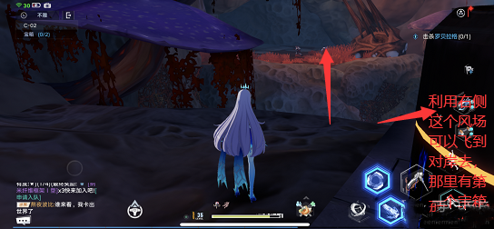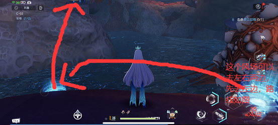 5、到了对岸之后还有一个风场,这个风场也是有两条路的,利用风场先飞往右侧对岸,如下图:这里会有第一个宝箱