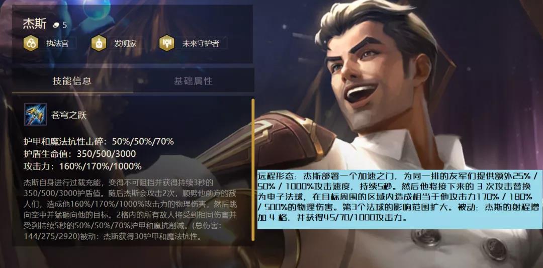杰斯这赛季给大家的感觉就是前排,但其实不然,杰斯站后排输出更暴力!杰斯炮形态下技能可直接增加自身较高攻速还能造成群体爆炸伤害,出装方面则考虑暴力输出装无尽、飓风、巨杀等,由于阵容有蔚,轻语的优先级则不高。