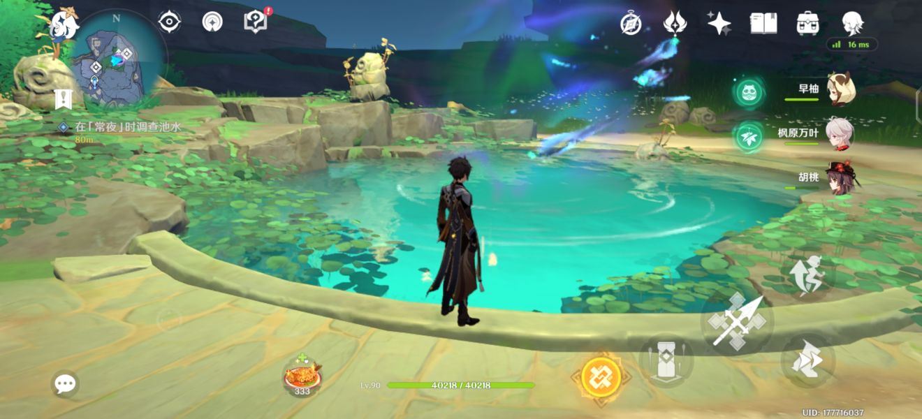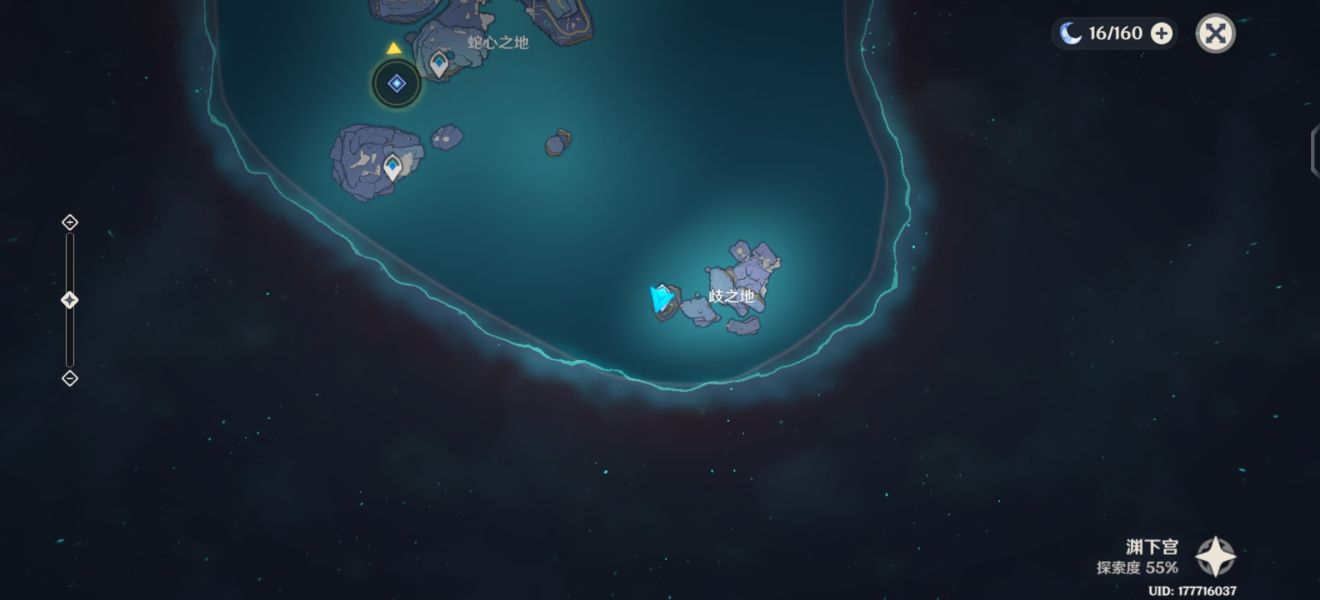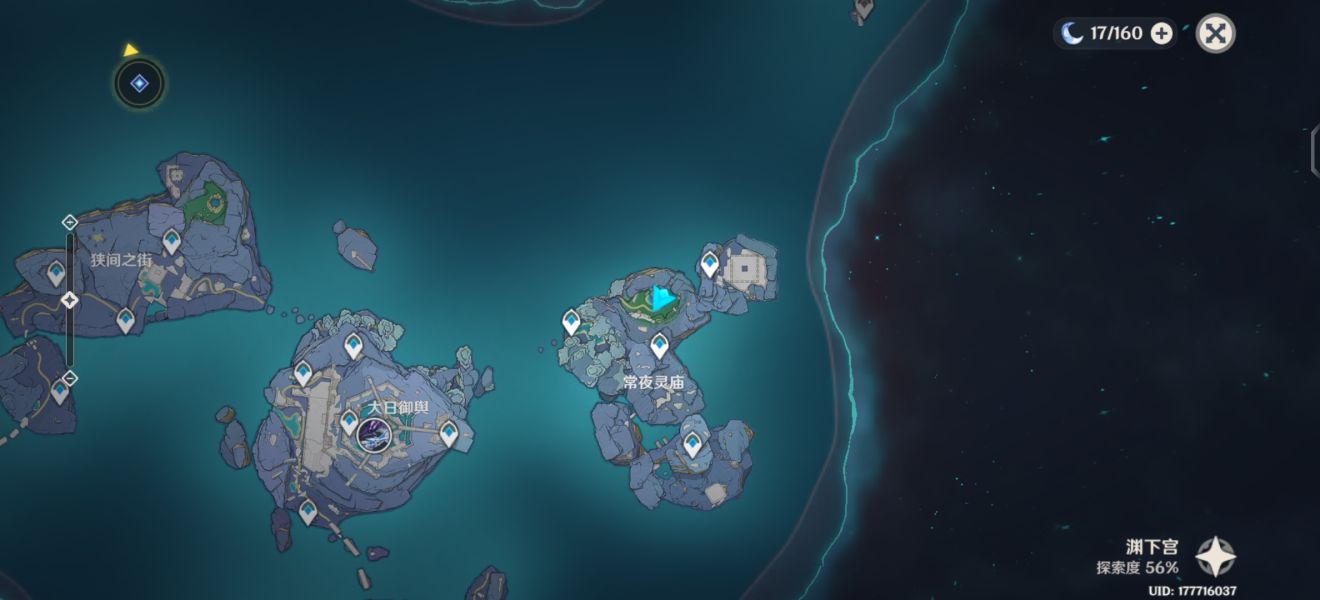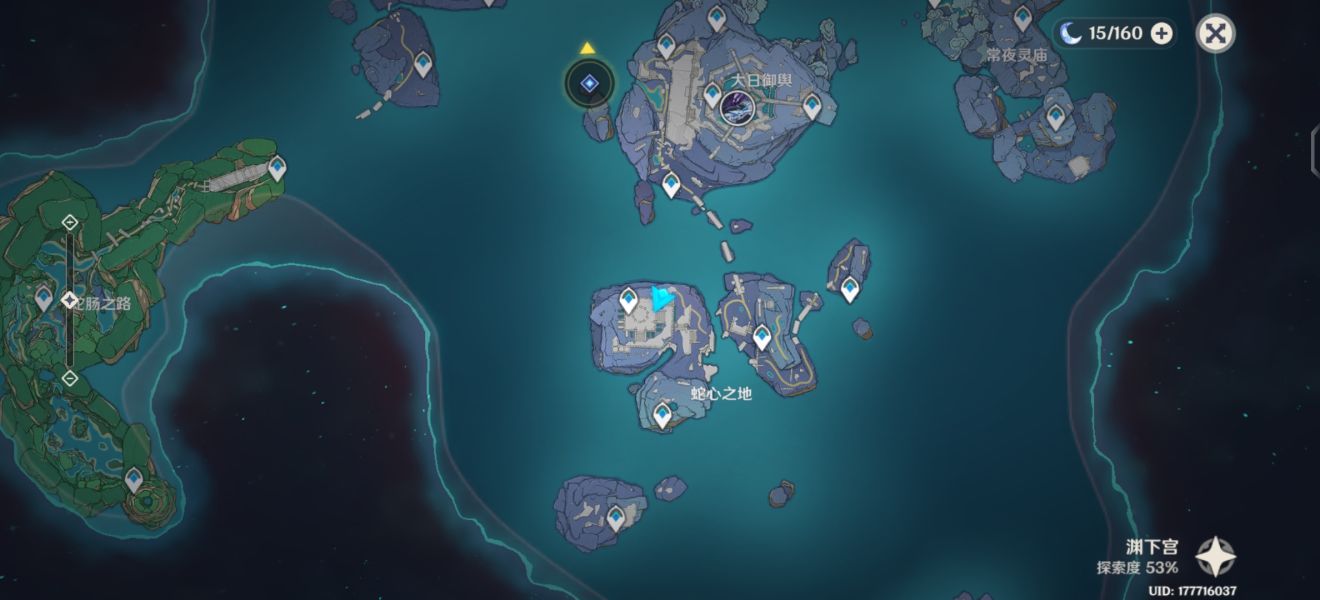2.补充一下:这里到各个岛只能在常夜模式下进行。部分岛屿相隔较远,可以装备加速飞行的团扇,避免万一掉下去找到地图上的水池,水池上面有鱼围绕的光团,飞进去就行了,如图: