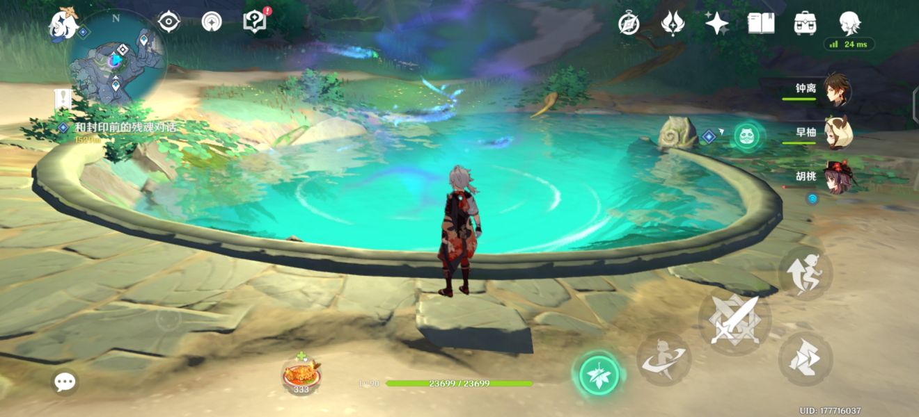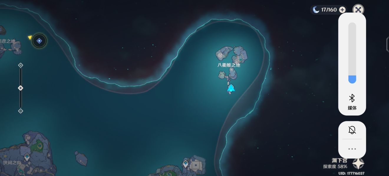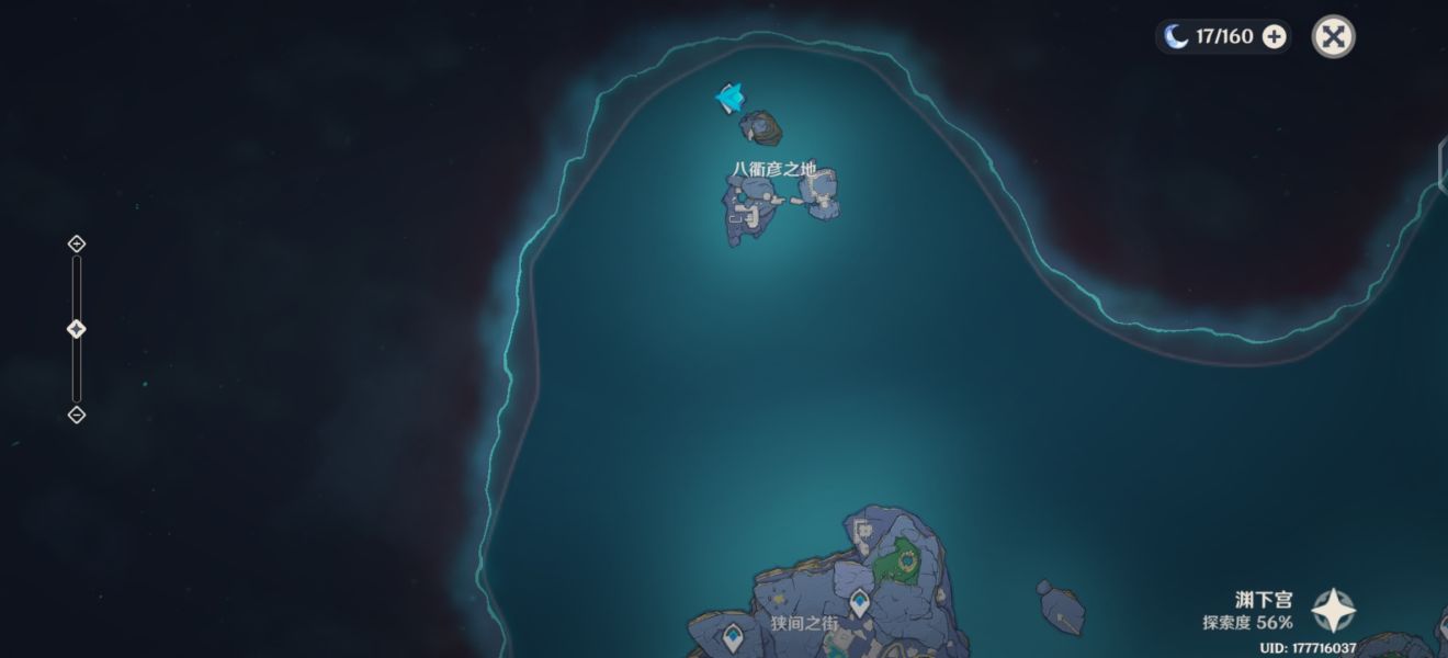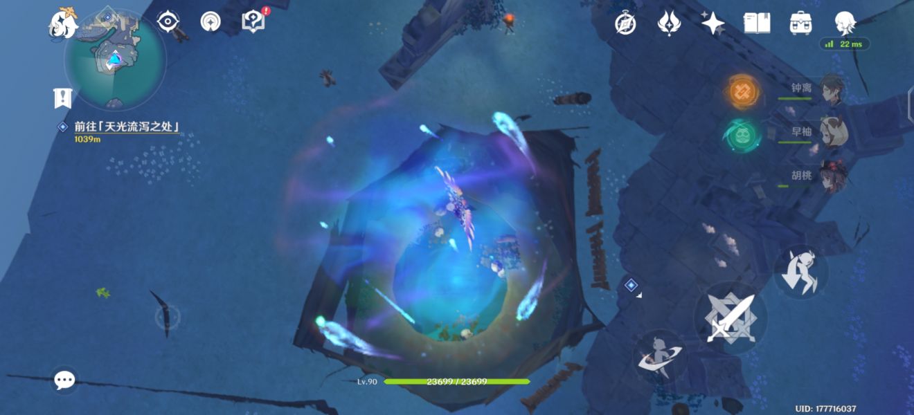 2.补充一下:这里到各个岛只能在常夜模式下进行。部分岛屿相隔较远,可以装备加速飞行的团扇,避免万一掉下去找到地图上的水池,水池上面有鱼围绕的光团,飞进去就行了,如图: