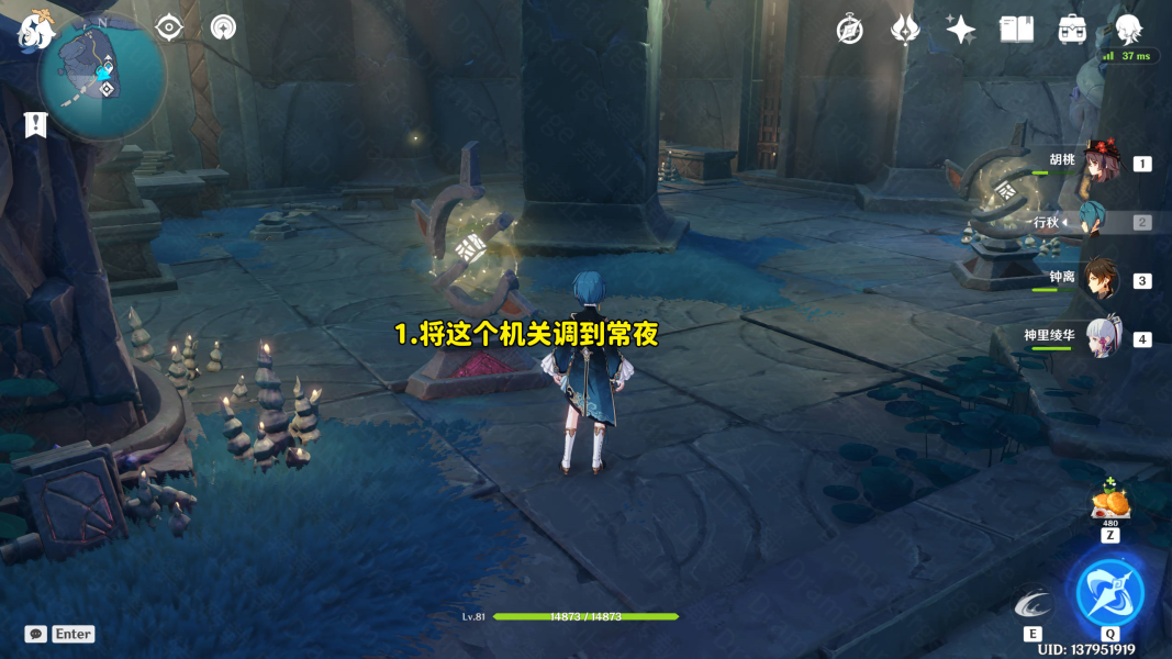 提示:此处解谜需要把日月轮转调到白夜(白天)。乱打一气就行,每个灯调到正确位置时会有直白的文字提示,不用担心调错。