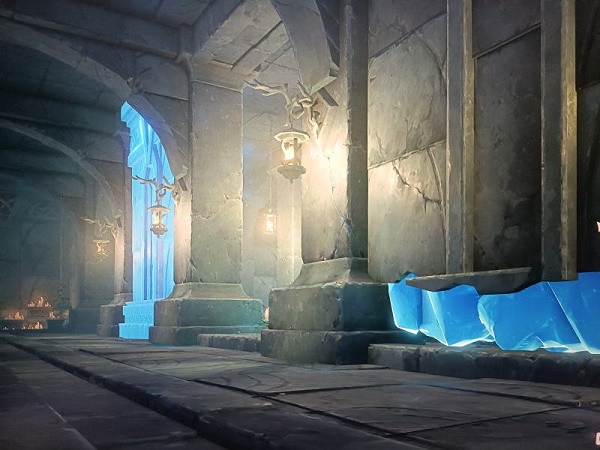 拉动中间一排柱子两边的拉杆使得中间的铁门全部收上去,然后前往左边或者右边攻击三角机关使得三面墙壁全部处于一排