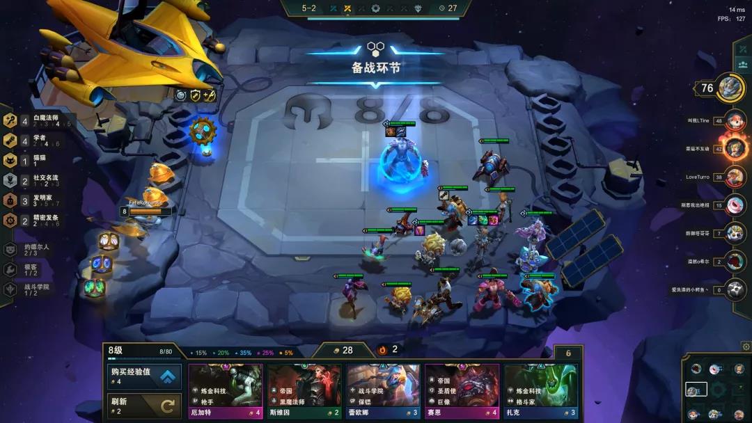 4-5或5-1拉8,大D4费卡的质量直至阵容成型,没有猫咪先用婕拉代替,血量健康尽量升9,9人口补杰斯前排基本就够打了,如果有学者转9人口也可开6学者3白魔,有白魔之心可开5白魔法4学者,另外外面没有人拿发条的话可以考虑在8人口追3,站位围绕名流位扎堆,在前排就让冰女或宝石踩。
