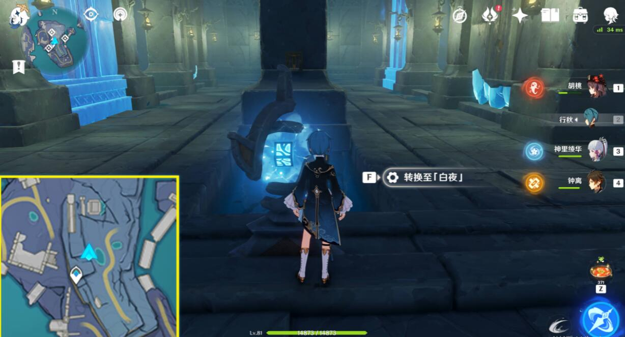 1、按任务提示进入迷宫,找到下图位置(面朝日夜回轮,背对华丽宝箱,地图朝正北方向),先将日夜回轮转到至“白夜”(白天)。