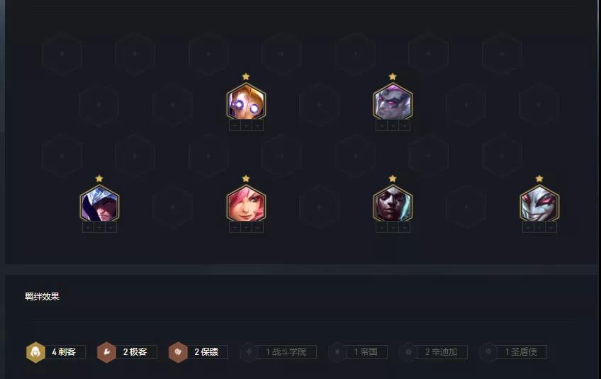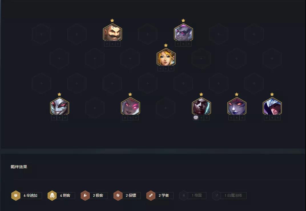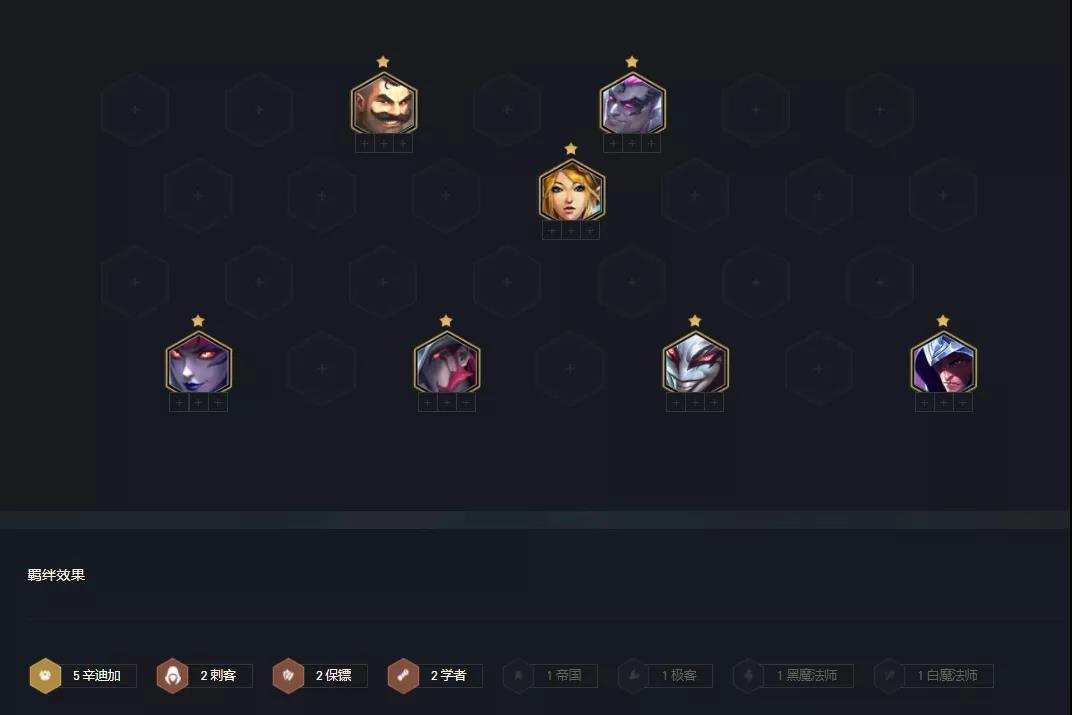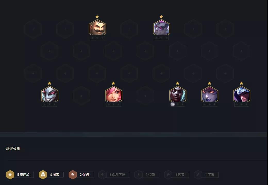 阵容羁绊:5辛迪加 4刺客 2保镖 2极客 2学者