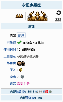 水晶座本身可以放置在平台上,而且紧挨着平台下方的两格可以是非物块。然而,水晶座的两边必须是实心块构成的。