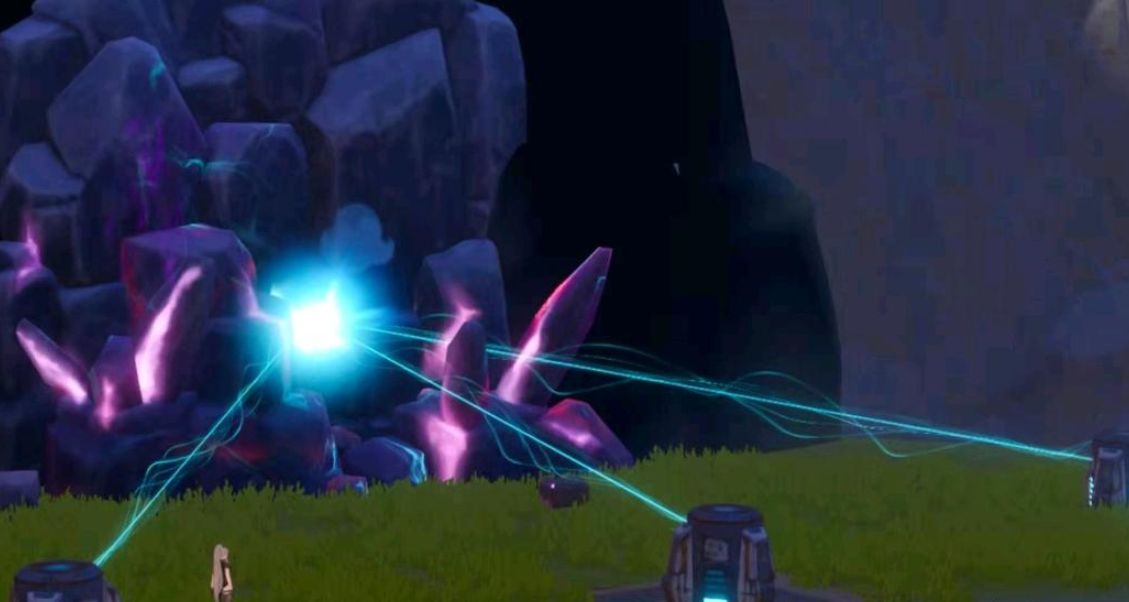 6、然后我们回到屏障位置,附近有三个可以交互的能量转化装置,我们按笔记的内容调整档位,从左到右是3、1、2。