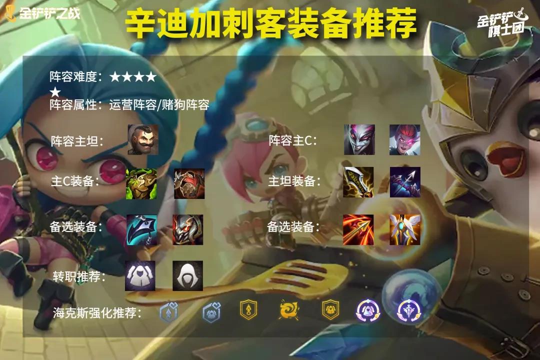 当小丑3星带有神装的情况下,那么5辛迪加6刺客无疑是最佳的选择,6刺客带来的高爆发,是不需要阵容拖到后期的,开局直接切后排就是秒。