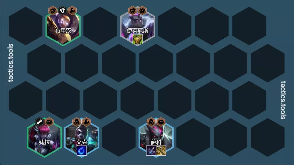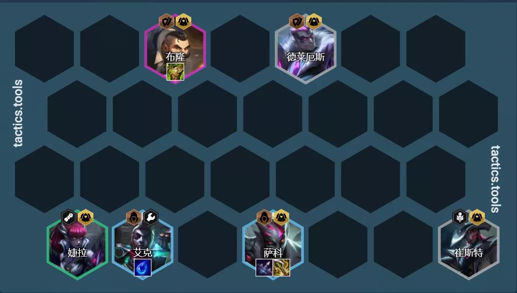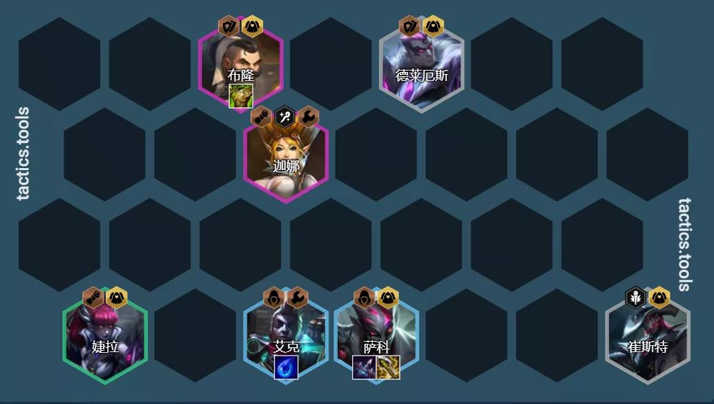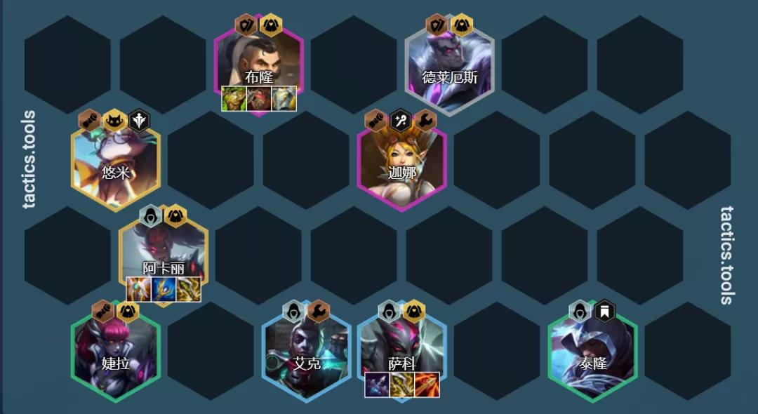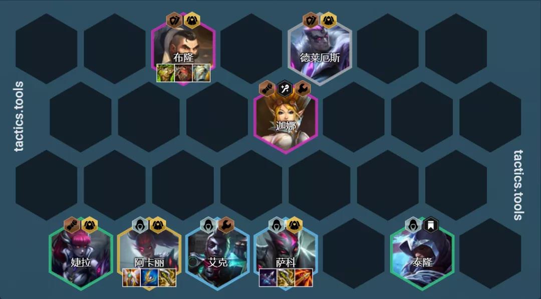 阵容组成:德莱厄斯、婕拉、泰隆、艾克、萨科、布隆、阿卡丽、迦娜、猫咪