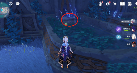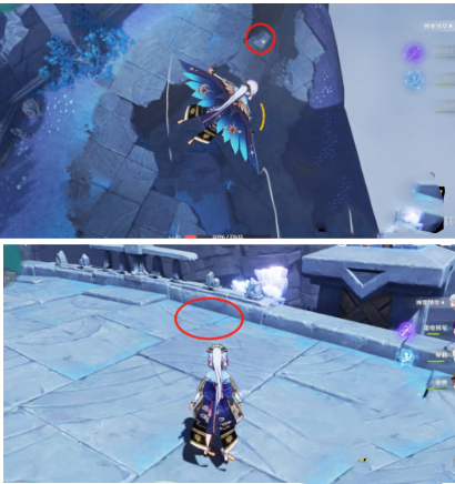3.标点4:传送回左侧传送点,向右后方跳下,滑翔至下图入口处,路过两朵骗骗花,上个楼梯,湖对面间隙里就是标点4。
