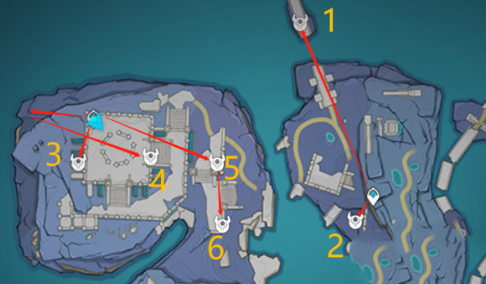 1.标点1-2:传送至蛇心之地右侧传送点,往上方断桥处飞去,标点1就在断桥上。