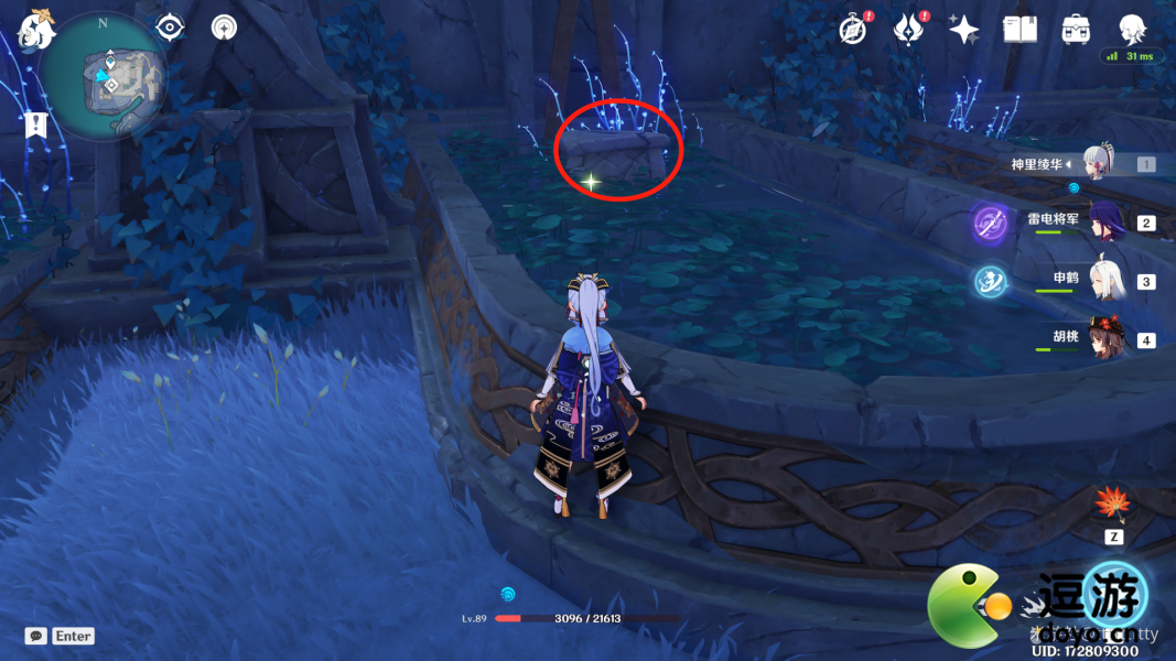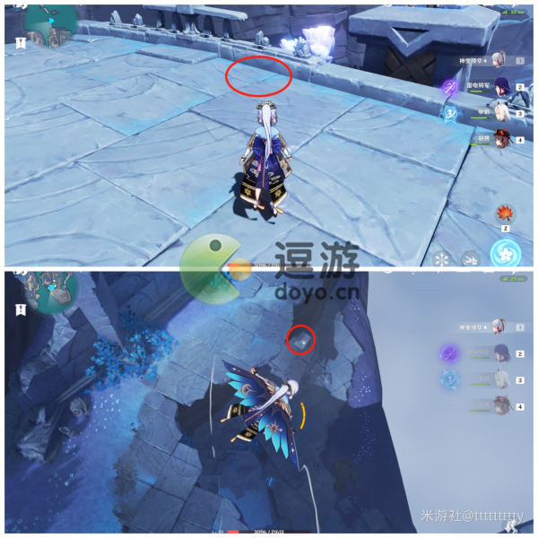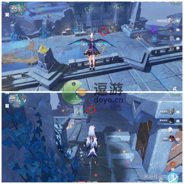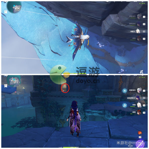 3.标点4:传送回左侧传送点,向右后方跳下,滑翔至下图入口处,路过两朵骗骗花,上个楼梯,湖对面间隙里就是标点4。