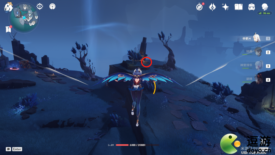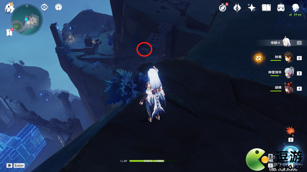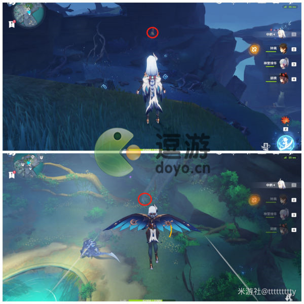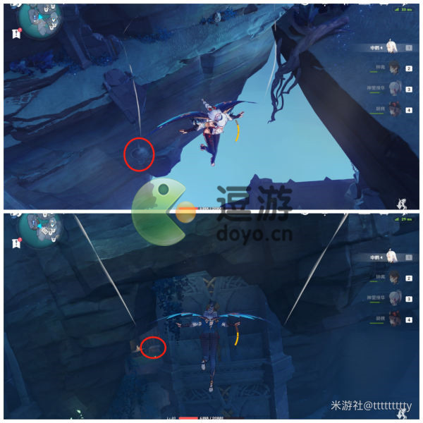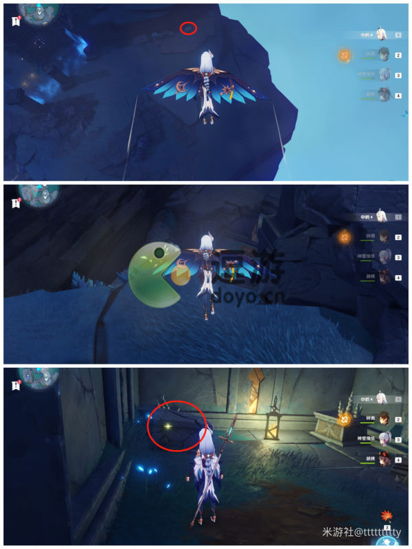 传送至常夜灵庙下方传送点,向右下方飞去,崖壁下方就是标点4。
