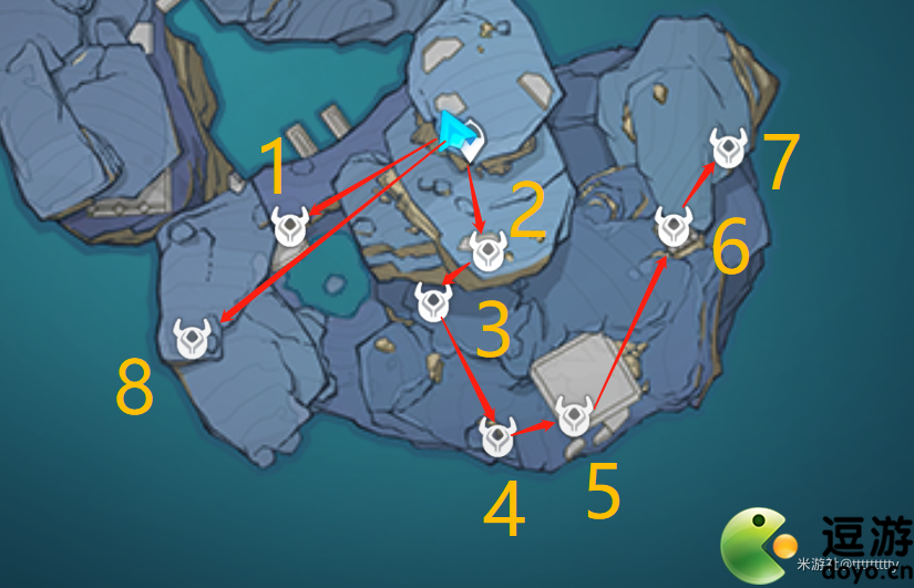 3.标点8:回到传送点,向着岛的最左边出发,箱子在远处的石柱下。