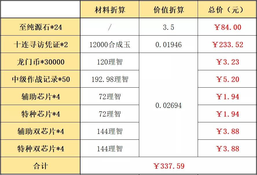 较之前的组合包而言:龙门比少了30000,中级作战记录和中级技能书各多了10本,整体也大差不差。等价换算成的RMB价值维持在:494.65元。